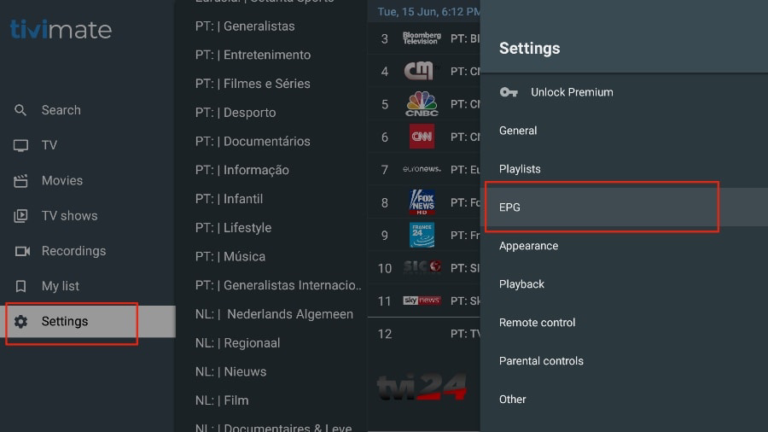 Si vous ne voyez pas d’EPG activé dans l’application TiviMate, envisagez de l’activer dans les paramètres de l’application .